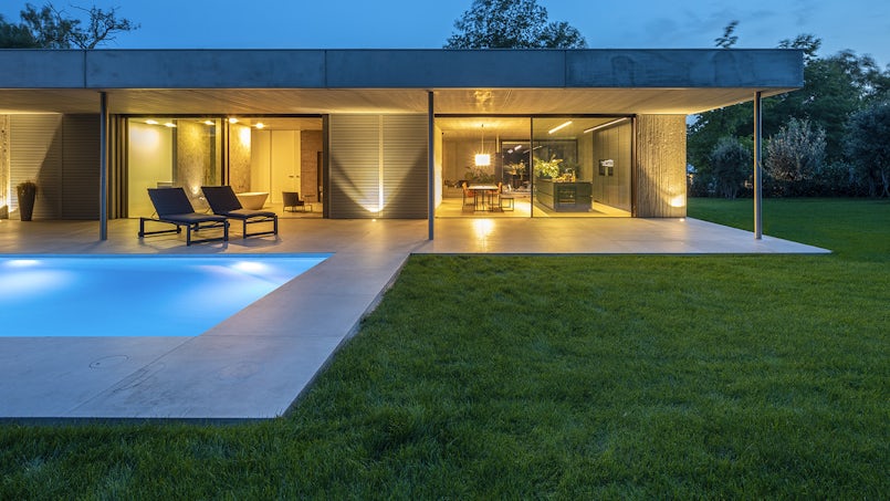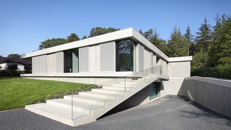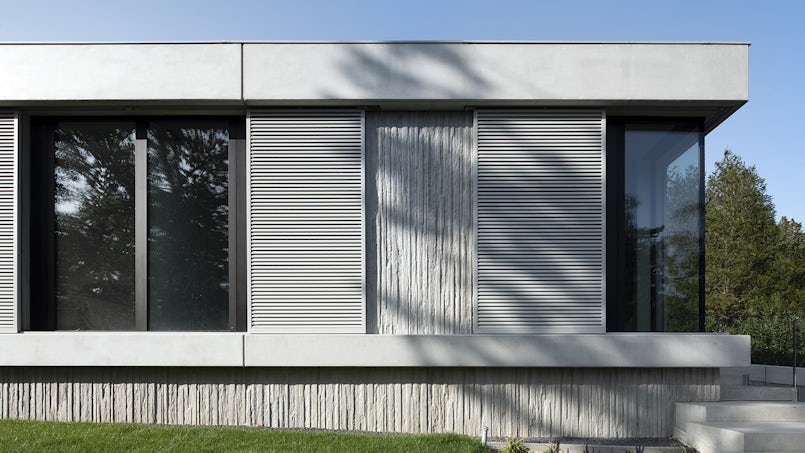 In droge zomermaanden geeft het een lichtgekleurde mediterrane indruk. In natte wintermaanden is het beton donkerder en absorbeert het de kleur van de omgeving. Bovendien kent de villa meerdere gedaanten. Over de volle lengte tussen de betonbanden van begane grond en dakrand bewegen panelen met aluminium horizontale lamellen in dezelfde kleur als het beton. Deze hebben de functie van zonwering maar zijn tegelijk ook privacyscherm.