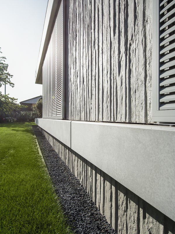 Bij deze villa is gekozen voor een duidelijke onderbreking in de vorm van een horizontale prefab betonband, zowel bij de overgang van souterrain naar begane grond als van gevel naar dak.