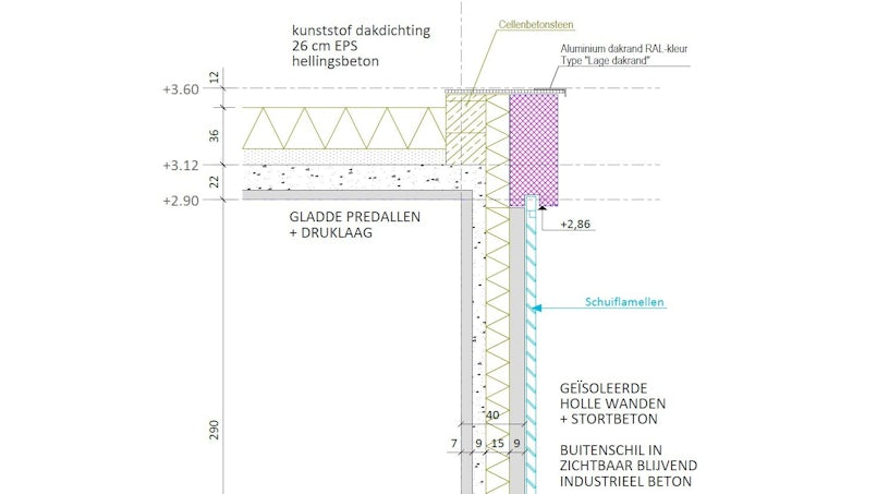 Dit was aanleiding voor een bijzondere invulling van de gevel. Tussen de horizontale betonbanden werden verticale elementen over de volledige verdiepingshoogte geplaatst: betonelementen met verticaal reliëf afgewisseld met minimalistische aluminium puien.