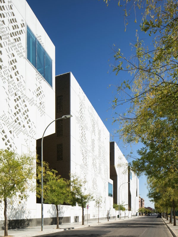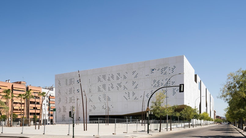 Hoe laat je een ultramodern gebouw ‘landen’ in een stad vol Unesco-werelderfgoed? Dat was de vraag die Mecanoo architecten zich stelde bij de ontwerpprijsvraag voor het Paleis van Justitie in het Spaanse Córdoba. Geïnspireerd door de plattegrond van de oude binnenstad met zijn binnenhoven en Islamitische architectuur, ontwierpen ze een gigantisch rechthoekig blok dat onderdak biedt aan een rechtbank met 26 zalen, een trouwkamer, een forensisch instituut, kantoren, een café, een archief, een gevangenis en een parkeergarage. In dit blok is een reeks inkepingen annex patio’s gemaakt, die daglicht en lucht binnenlaten terwijl zonlicht en blikken van passanten buiten blijven. Het geheel is omkleed met een spierwitte ‘sluier’: een witte geperforeerde gevel van glasvezelversterkt beton (GFRC).