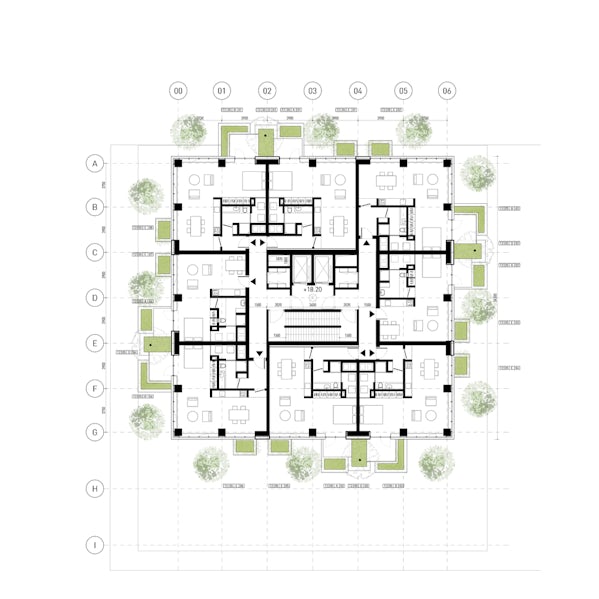 Uitgangspunt van de architect was dat bij iedere loft tenminste één boom kwam te staan.