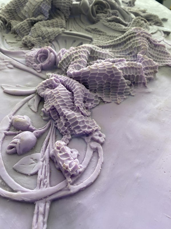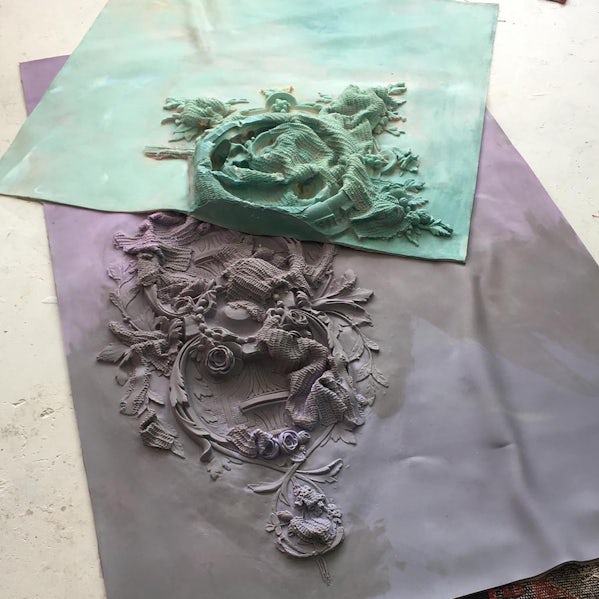 Voor haar project Wyckoff NYC maakte Nynke met diverse lagen vloeibaar rubber mallen; afdrukken van onder meer maïs en ornamenten uit de Gouden Eeuw, die ze vond in bepaalde bouwwerken in Hoorn. De afgietsels maakt zij door een aantal lagen vloeibaar rubber over elkaar aan te brengen, totdat ze tevreden is over de dikte. “Dat rubber kan ik in elke gewenste consistentie maken. Ook ‘pindakaas’ dikte zodat het niet druipt en ik snel een dikke laag kan aanbrengen.” Dat laat ze drogen en dat wordt dan weer verwijderd en fungeert als (delen van) een mal. Om de rubberen afdrukken te testen, maakte ze daarvan eerst gipsen afgietsels.