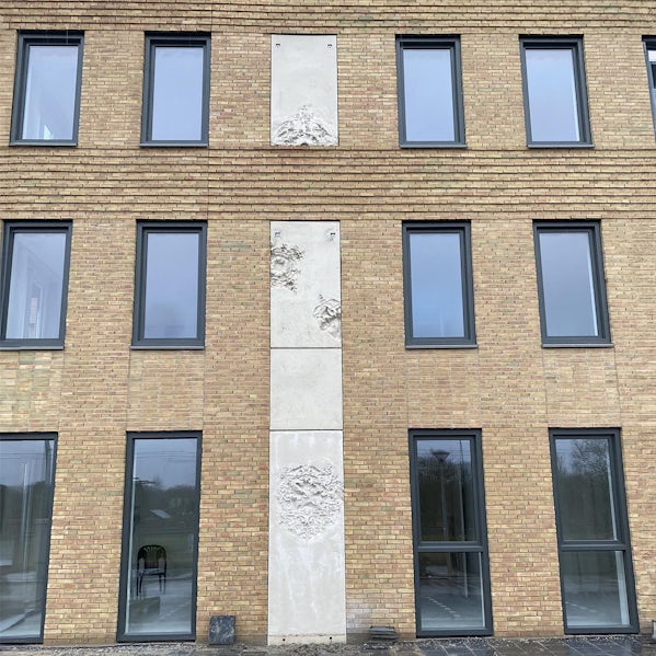 Vervolgens voegde Nynke de diverse rubberen mallen samen tot één geheel. Bij de betonleverancier werd dit bevestigd in een houten bekisting met de afmeting van één paneel. “Daarna heb ik ‘gespeeld’ met de samenstelling van de rubberen afdrukken. Zo heb ik soms slechts een deel gebruikt, of het rubber afgietsel doorgesneden en een deel van het beeld op zijn kop terug laten komen. Zodoende zijn er zeven verschillende betonnen afgietsels gemaakt. Dus op die 30 panelen zie je af en toe een herhaling van het beeld.”