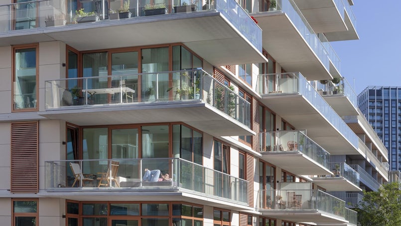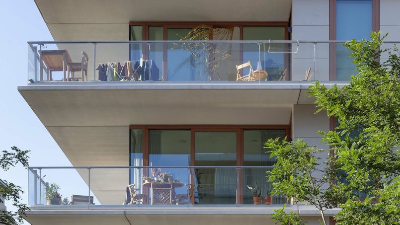 Dat beton esthetisch bepalend kan zijn voor een project, bewijst architectuurstudio DP6 met het Amsterdamse appartementencomplex The Row. Dit woonblok met daarin 92 zeer diverse woningen voor de vrije sector huur, is ontworpen op comfort en woongenot. Daarom heeft het zeer royale buitenruimtes. De balkons dragen door hun vorm en overhoekse plaatsing bij aan de opvallend ranke look, in het statige stedenbouwkundige grid van de nieuwe wijk ‘Aan het IJ’.