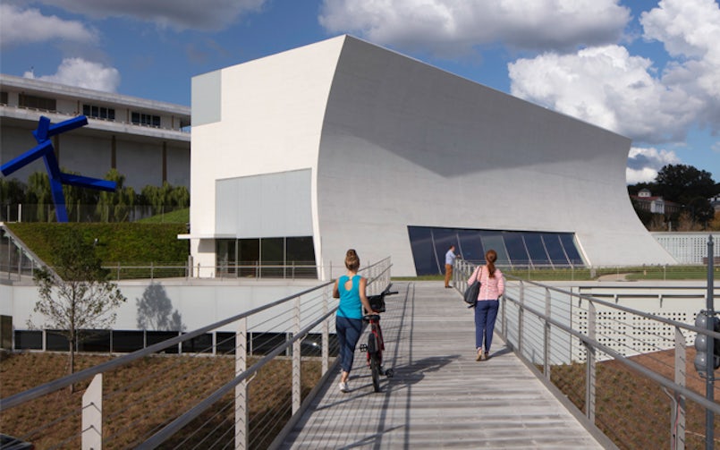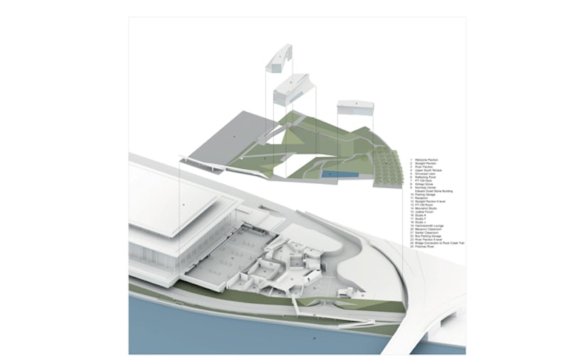 In plaats van een uitbreiding op of aan het bestaande gebouw, heeft Steven Holl Architects een reeks paviljoens ontworpen voor het John F. Kennedy Center for the Performing Arts op het grootste groene dak in Washington D.C.