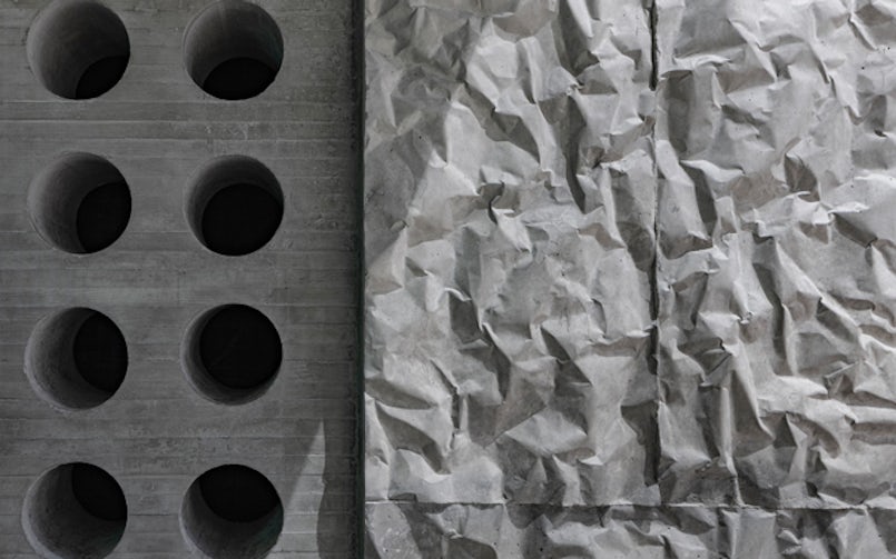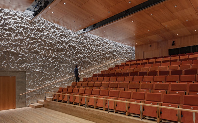 De opvallende schoonbetonnen structuurwanden in de oefenruimtes en theaterzalen hebben een grillig reliëf. De textuur is speciaal voor dit project ontwikkeld in nauwe samenwerking met een betonspecialist en een akoestisch expert. Urethaan structuurmatten zijn gebruikt om het betonoppervlak te vormen. Er is eerst een positieve plug gemaakt van een verkreukelde metalen plaat, die vervolgens is gebruikt om het urethaan te gieten. Er is één basismat gemaakt die steeds 90 graden is gedraaid voor een afwisselend patroon. Voor de uitvoering zijn de structuurmatten op achterhout bevestigd. De structuurwanden bestaan uit zelfverdichtend beton