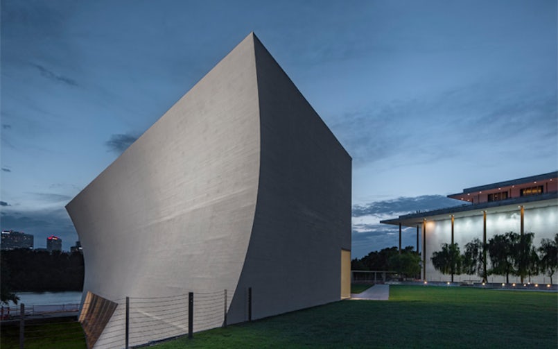 Dubbelgekromde gevels en wanden van ‘gekreukeld’ beton sieren de in het werk gestorte uitbreiding. De nauwkeurig ontworpen details en de afstemming met de aannemer resulteerde in zeer vloeiende vormen buiten, in contrast met het grillige reliëf van de akoestische wanden binnen.