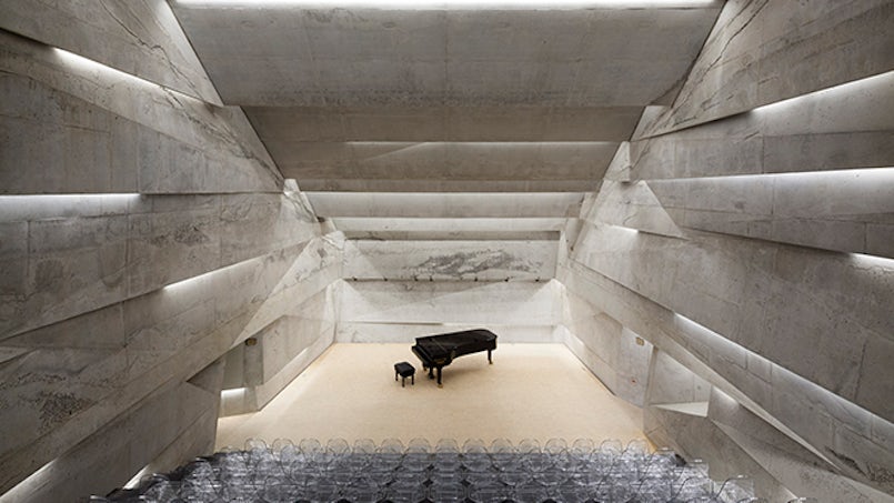 De textuur van het beton en de complexe vormen spelen een cruciale rol in de akoestiek van de concertzaal in Blaibach (foto Edward Beierle)