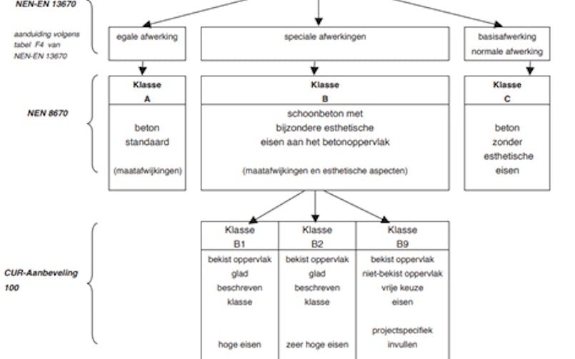 De ontwerpresultaten van de architect (en de constructeur) zullen worden weergegeven in de projectspecificatie (bestek) van het project. In deze specificatie, veelal gebaseerd op de standaardbestekken STABU of RAW, wordt voor het ontwerp en de uitvoering verwezen naar de betonvoorschriften. De besteksbepalingen over de uitvoering van schoonbeton verwijzen naar de norm NEN-EN 13670 ‘Vervaardigen betonconstructies’ en NEN 8670 ‘Aanvullende voorschriften vervaardiging’. In deze norm zijn beoordelingsklassen opgenomen voor de oppervlakken van beton. Voor oppervlakken met esthetische eisen geldt klasse B. De eisen voor klasse B moeten in de projectspecificatie nader zijn opgenomen. Bij bijzondere toepassingen zal de ontwerper/bestekschrijver zijn eisen onder ‘klasse B’ moeten omschrijven.