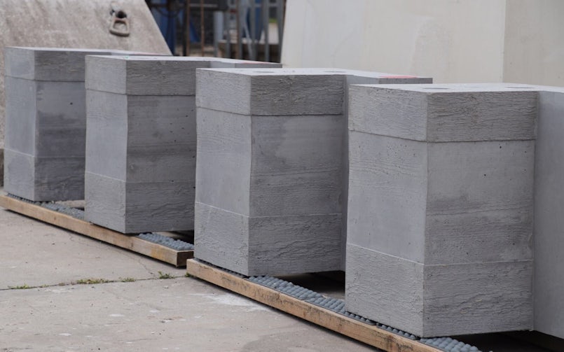 Om het beton textuur te geven is ervoor gekozen om de penanten bij het storten een houtstructuur mee te geven. Niet via op maat gemaakte kunststof mallen met houtprint zoals tegenwoordig gebruikelijk is, maar met een traditionele houten bekisting van ruwbezaagd en doorleefd materiaal, afkomstig uit de botenbouw. Zo kregen de verticale penanten aan de straatzijde, die het voorste deel van het gevelreliëf vormen, een vrij grove structuur.
