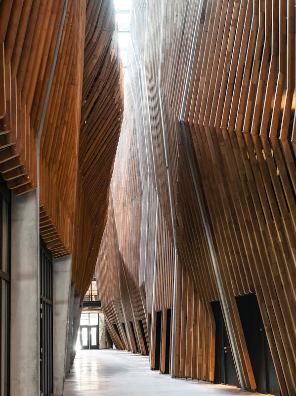De 'canyon' wordt vormgegeven door de betonnen ribben met daartussen latten die de verschuivende lijn van de knik vormen (foto: Sebastian van Damme)