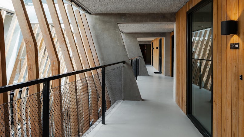 Om de betonnen ribben te kunnen produceren en om de beoogde afwerking met een houten profilering werkbaar te maken, is ervoor gekozen om de canyon vorm te geven met knikken die alleen ter plaatse van de verdiepingen zijn aangebracht. Zo kon er ter plaatse van de galerijen op de kopse zijde van de wanden worden gewerkt met een beperkt aantal hellingshoeken. En zo werd het mogelijk om de uiteinden van de wandschijven via prefabricage te realiseren. “Uiteindelijk waren hiervoor slechts 7 mallen nodig. Door deze aanpak was geen complexe doorstempeling nodig in de canyon en werd het ontwerp duurzamer en technisch en financieel haalbaar.”