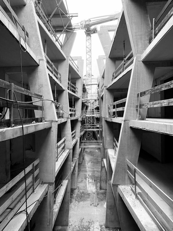 Tijdens de bouw is de ribbenstructuur goed te zien in de 'canyon', met steeds de knik op vloerhoogte (foto: Patrick Meyers)