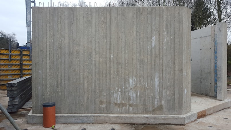 De enorme overstekken van de woning veroorzaken enorme trekkrachten. Daarom moesten de betonnen wanden dik genoeg zijn. Met visuals in de pc heeft de architect uiteindelijk gekozen voor 30 cm. “Zouden de wanden in het gebouw wit zijn geschilderd, dan was 50 cm ook ok, maar in een grijze betonlook vonden wij dat veel te zwaar overkomen. Met andere woorden: ‘de keuze van uw materiaal bepaalt ook uw dimensies’.”