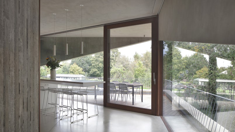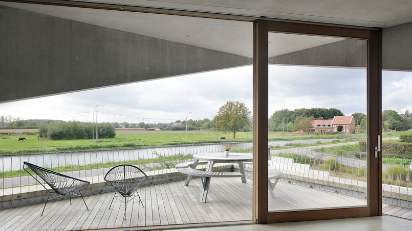 Langs de Leuvense vaart bij Mechelen (B) staat een fraaie, geheel uit beton opgetrokken asymmetrische woning. Het resultaat van een ingenieus ontwerp, waarbij het borgen van uitzicht en veiligheid hand in hand gaan. “Het perceel is zeer bepalend geweest voor ons ontwerp”, zegt architect Basile Graux. Het concept van de woning is het resultaat van een creatief proces, waarbij de architecten in één consistent verhaal rekening moesten houden met twee belangrijke parameters, die op het eerste gezicht heel tegenstrijdig lijken: het gevaar van inkijk tegenover het waarborgen van het weidse uitzicht. De woning ligt namelijk op een smal, lang perceel. Twee meter lager dan de dijk, waarover bovendien een weg loopt. Zowel de buren als passanten zijn dus elke dag vlakbij.