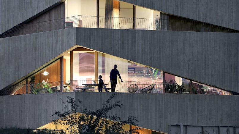 Zo ontstond langzamerhand het idee voor een geheel van drie betonnen bouwlagen, waarbij er op de eerste en tweede verdieping gewoond wordt. Om ervoor te zorgen dat de bewoners als ze naar buiten willen niet steeds naar beneden hoeven, zijn op elke woonlaag grote terrassen gecreëerd: in de opgetilde betonnen luifels zitten driehoekige uitsparingen die telkens naar binnen waaieren.