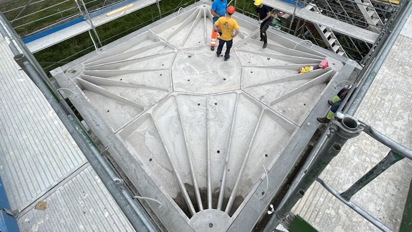 De laatste spreker Francesco Ranaudo van Vaulted promoveerde recentelijk bij Block Research Group van ETH Zürich voor zijn deel aan het ontwerp van de ‘funicular floor’, een innovatief vloersysteem waarbij dáár materiaal zit waar het nodig is voor het interne krachtsverloop in de vloer. Daarbij kan wel tot 70% materiaal worden bespaard op beton en 90% op wapeningsstaal. Efficiency, duurzaamheid en esthetica worden hier gecombineerd in een vloersysteem dat aan regelgeving voldoet. In 2023 werd Vaulted opgericht om deze oplossing naar de markt te brengen. In zijn presentatie liet hij zowel het onderzoek als de concrete projecten met dit systeem zien. Met deze presentatie gaf hij ‘antwoord’ op de hangende vraag in de discussie: ‘ja, het is mogelijk om innovatieve technieken voor slank construeren om te zetten naar praktijkproducten.’