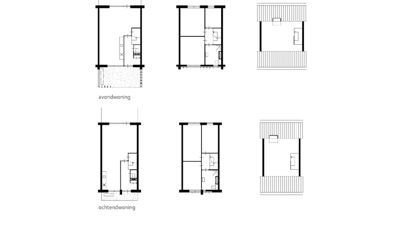 Het prefab betonsysteem van Voorbij liet de mogelijkheid om de breedte en diepte van de woningen te variëren (tussen 4,8 en 6,3 m). “De meeste huizenblokken liggen in noord-zuidrichting”, legt Bosch uit. “De woningen die de ochtendzon krijgen, hebben we iets smaller (5,4 m) gemaakt met diepe achtertuinen en een strook voor het huis waar je ‘s ochtends koffie kunt drinken. “De woningen met avondzon zijn extra breed (6,3 m), met een ondiepere tuin en aan de voorzijde een groot terras. Die buitenruimtes zijn belangrijk voor de opbouw van de wijk, en de levendigheid.” Naast woningen van twee lagen en een kap hebben we ook drielaagse woningen gemaakt, die we een kwartslag draaien op de hoek. Dat soort varianten geven schwung aan de stedenbouw.”