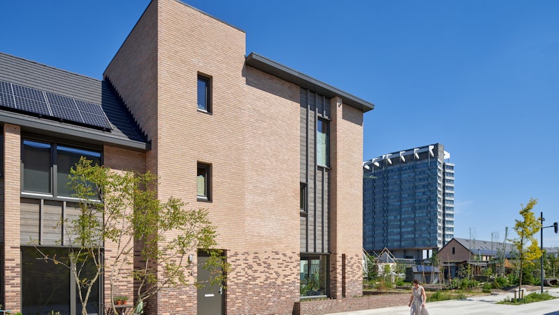 “Tempo is belangrijk, maar het moet wel kwaliteit hebben”, zei Hugo de Jonge, minister van Volkshuisvesting en Ruimtelijke Ordening, in een werkbezoek met de Branchevereniging voor Nederlandse Architectenbureaus (BNA), over de woningopgave van één miljoen woningen tot 2030. De BNA gelooft ‘dat duurzaam en circulair bouwen moet en kan, ook met het benutten van standaardisering en industrialisering’. De kunst is om met standaardhuizen iets te maken dat specifiek is voor de plek, zegt Bosch. Geïnspireerd door de historie van de locatie, waar ooit een steenfabriek stond, ontwikkelden de architecten met Brabantse leem twee verschillende gevelstenen die in patronen zijn vermetseld.