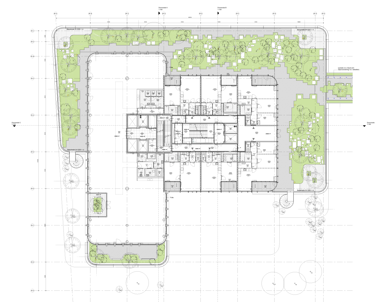 Op de daken liggen semi-openbare tuinen, ook vanaf de andere toren bereikbaar via een met groen omzoomde loopbrug. Onder zware elementen als bomen en keien ligt een verdikte breedplaatvloer. “Dankzij vroeg overleg met de groenadviseur is de beplanting slim gepositioneerd. Daarbij beperkt de constructieve versterking zich tot waar die echt nodig is.”