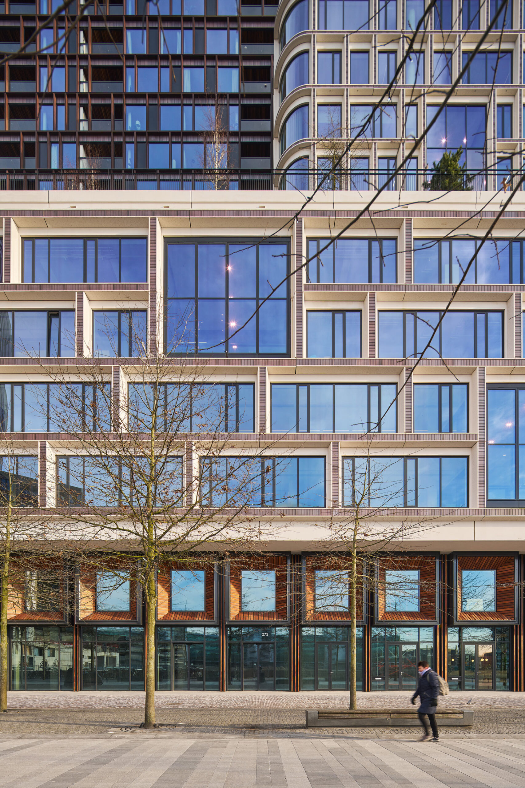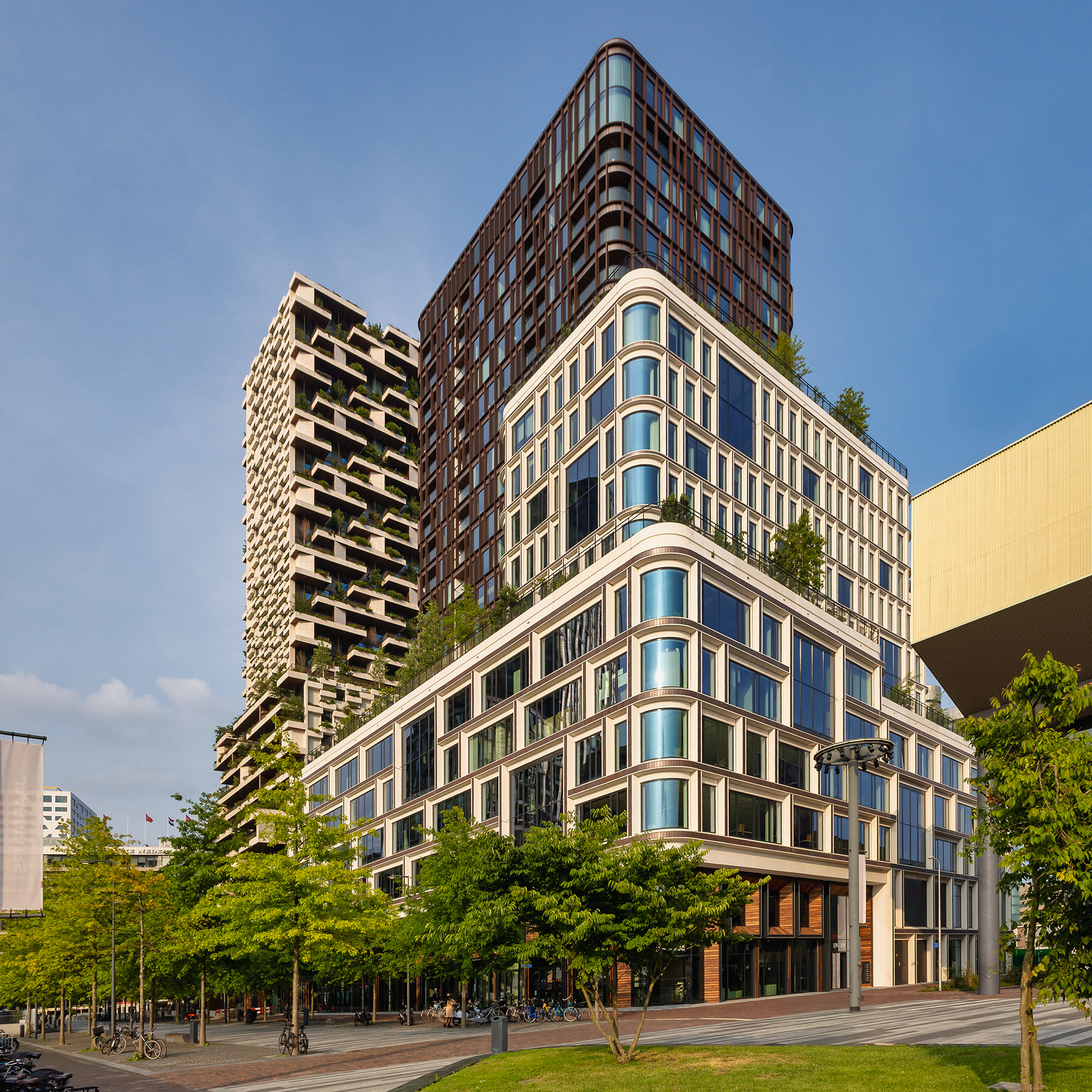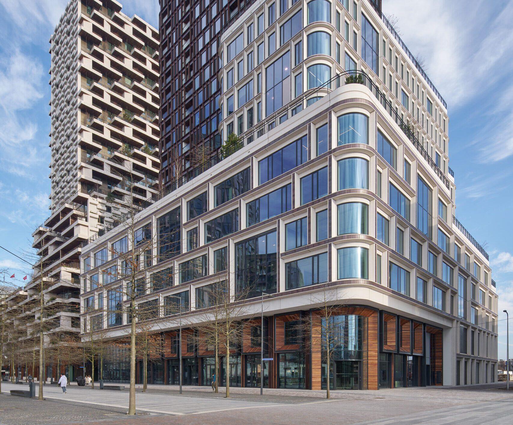 Jeroen Schilder (senior architect MVSA): “De betonnen vloeren en kolommen zorgen voor structurele stabiliteit, terwijl de wintertuinen zorgen voor daglicht en functioneren als natuurlijke filters voor lucht en geluid.” Het contrast tussen transparante glasgevels en solide beton geeft het gebouw zijn opvallende uitstraling en versterkt de beleving van openheid. De groene plekken zijn zo ingericht dat bewoners en bezoekers in alle seizoenen verbinding ervaren met de natuur.