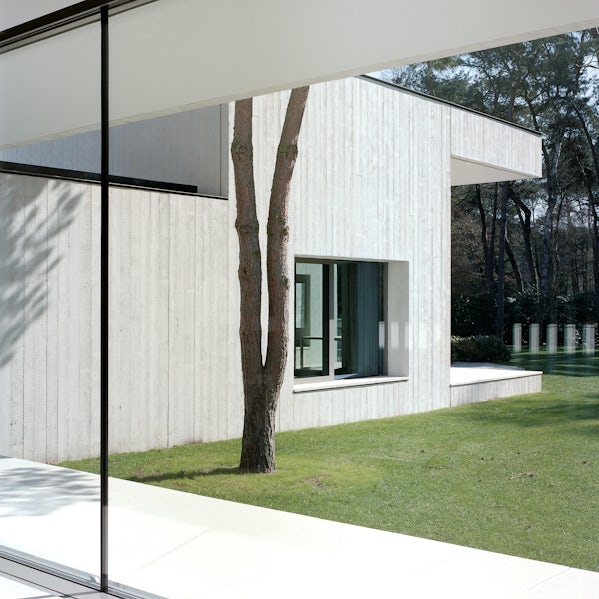 Vanuit een rustige bosweg in Waalre sta je ineens oog in oog met een villa in wit beton die niet zou misstaan in de nieuwste James Bond film. “Niet alleen het ontwerp van deze villa – in vorm en afmeting – is spectaculair, maar vooral ook de uitvoering en de detaillering”, aldus Henk Oude Kempers, adviseur schoonbeton. Zowel het exterieur als het interieur is volledig uitgevoerd in spierwit beton. Door de eenvoud van het ontwerp roept dit een beeld op van Zwitserse architectuur.