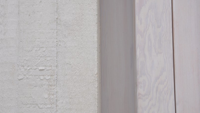 De schoonbetonwand laat direct na het ontkisten nog splinters zien van de grof gezaagde Siberische planken bekisting. Er vindt een nabewerking plaats van poetsen en schuren van de wand met esthetische mortel.