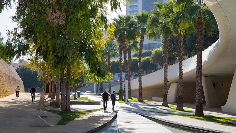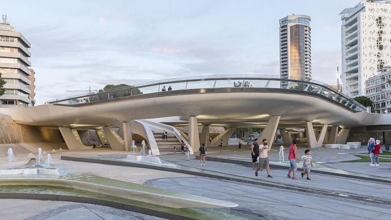 Over de voormalige vestinggracht rond de Cypriotische hoofdstad Nicosia bouwde Zaha Hadid Architects een betonnen brug die dubbelt als openbare ruimte: Eleftheria Square, wat ‘vrijheidsplein’ betekent. Om uitdrukking te geven aan de symbolische waarde, zijn de kolommen vormgegeven als armen die zich omhoog uitstrekken, uitgevoerd in helderwit beton.
