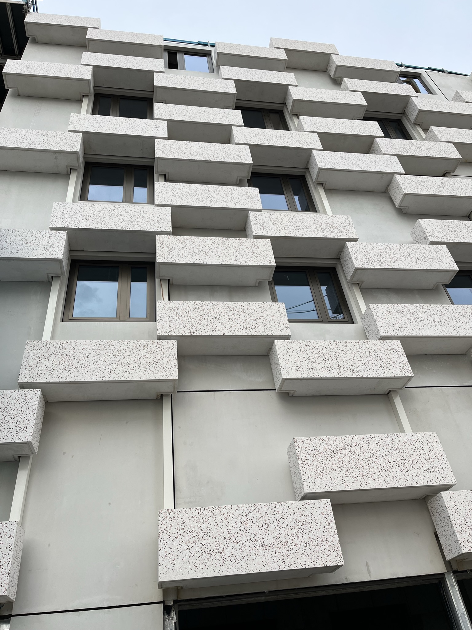 Op de 7e en 13e verdieping verandert de plattegrond van de toren en wordt het gebouw smaller. Vanaf hier zijn betonnen gevelpanelen (kopgevels) toegevoegd, waaraan op een slimme manier kleine plantenbakken bevestigd zijn: door de herhaling in het patroon lijken ze willekeurig geplaatst, wat zorgt voor een speels beeld.