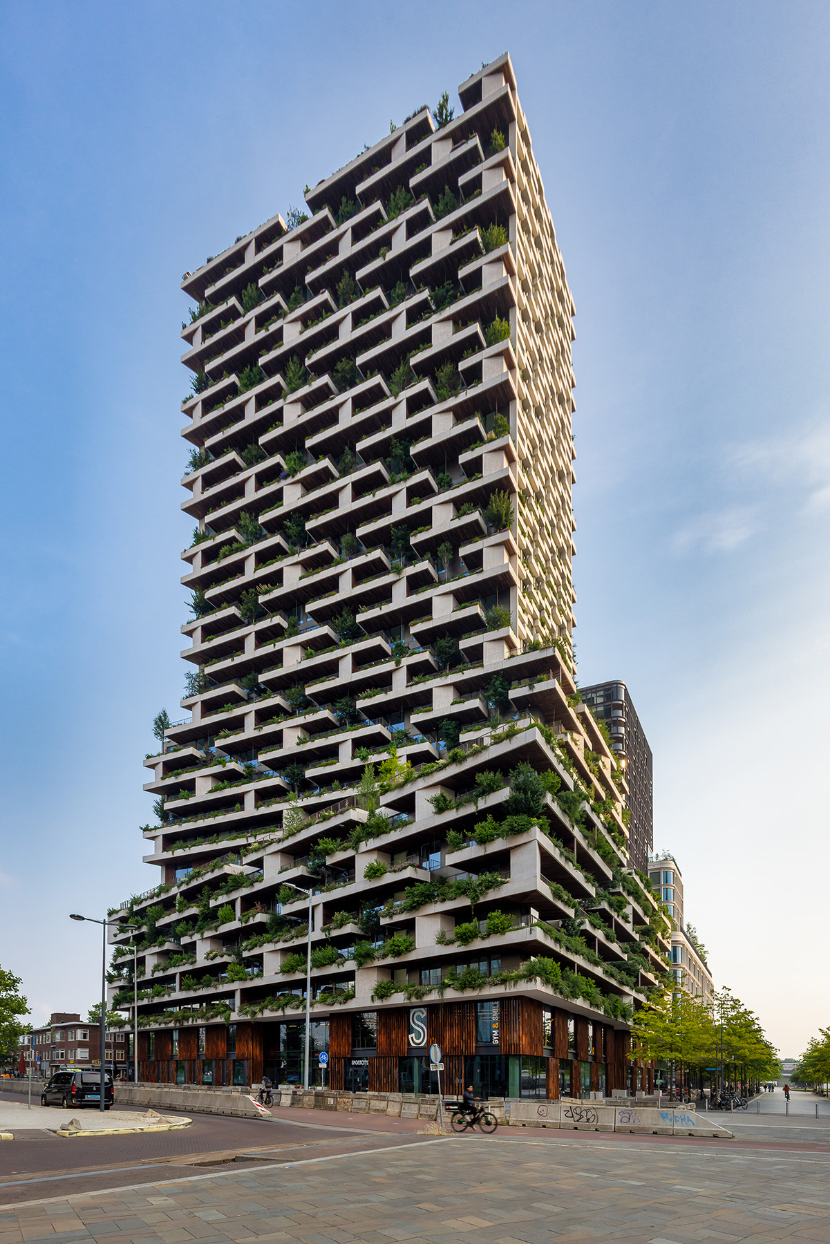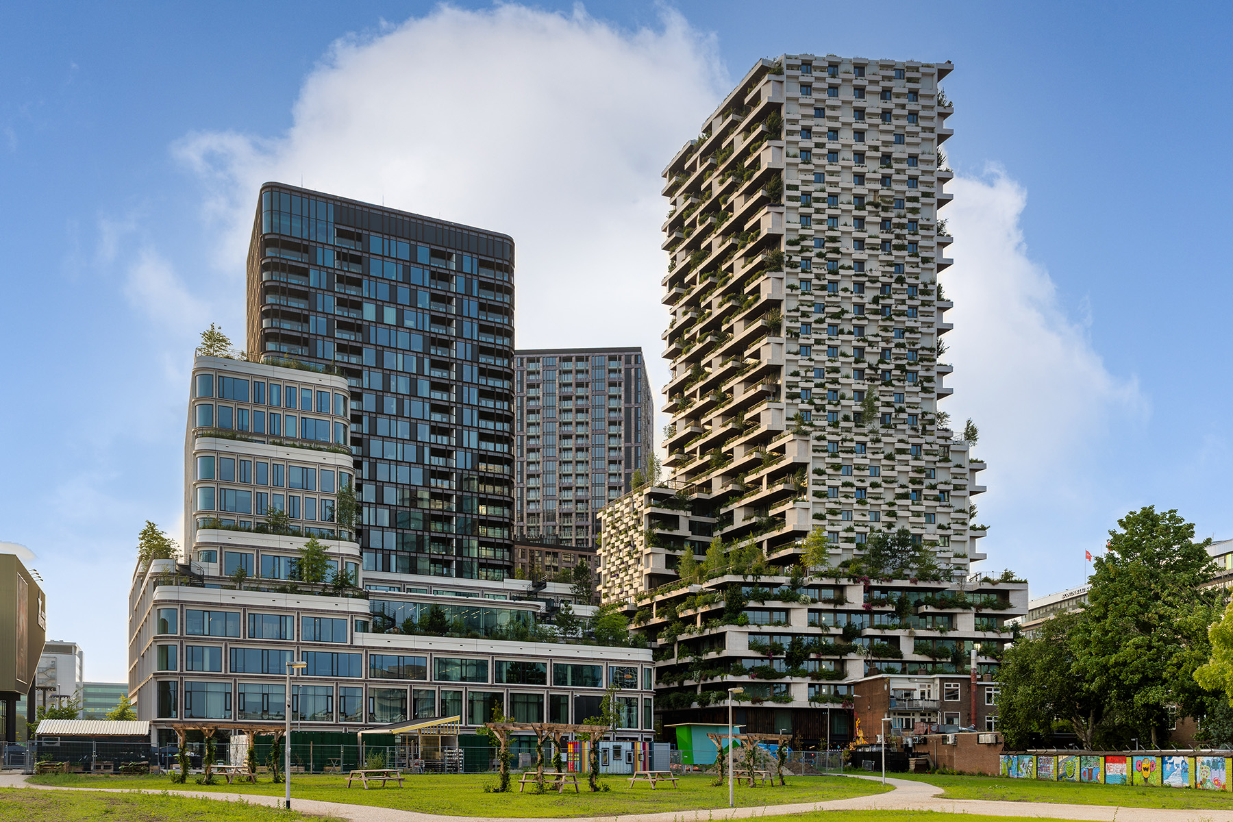 De hoogste toren van 104m, van de hand van de Italiaanse studio Stefano Boeri Architetti, herbergt een verticaal bos dat bestaat uit meer dan 300 bomen en een veelvoud aan struiken en planten (meer dan 30 verschillende soorten). Je kunt dit project zien als een Nederlandse variant van Boeri’s eerste succesvolle project waarbij groen en gebouw op bijzondere wijze gecombineerd zijn: het Bosco Verticale in Milaan. Net als de eerder gebouwde Trudo Toren in Eindhoven, die ook van de hand van deze architect is.