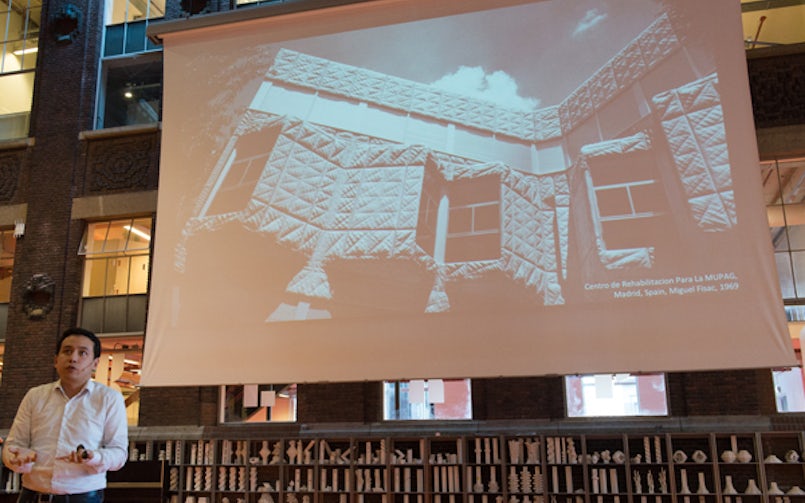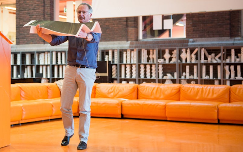 Aan het einde van de eerste dag en na een eerste aanraking met beton in de vorm van een teststort, werden de studenten nog wat extra opgewarmd door de eveneens eerste Tektoniek-lezing. Een dubbellezing. Rob Nijsse (hoogleraar Structural Design TU Delft / ABT) vergeleek de materiaaltechnische resultaten en toepassingsmogelijkheden van beton en glas. Diederik Veenendaal (BLOCK Research Group, ETH Zurich) ging in op recente ontwikkelingen in de optimalisatie van textielgevormde betonconstructies. De Oranjezaal in het gebouw BK City (TU Delft) werd aangevuld met professioneel werkzame architecten, constructief ontwerpers en producenten uit de betonindustrie.
