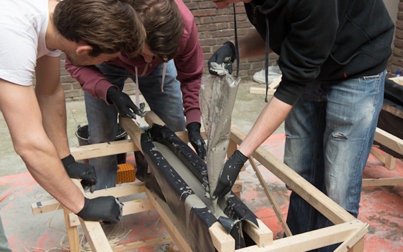 Met dank aan sponsor Weber Beamix hadden de studenten voldoende materiaal tot hun beschikking. Met diverse teststorts deden zij de nodige ervaring op. Daarmee konden ze het maakproces nog op tijd bijsturen. Door naar het beton te ‘luisteren’ en te volgen wat het materiaal wil doen tijdens het storten, verharden en ‘ontkisten’, kregen de studenten al gauw gevoel voor wat er wel en niet mogelijk was en hoe theoretische krachtswerking in de praktijk tot uiting kwam. Met als gevolg fantastische resultaten in een periode van slechts vier dagen.
