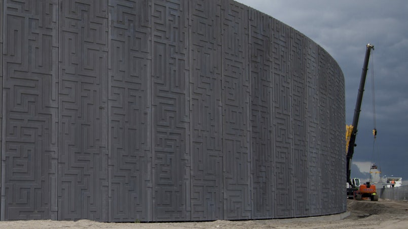 Vooral de productie van de bijna zwarte elementen bleek complex: “Omdat zwart beton per definitie verkleurt, en vanwege de gewenste patronen. Er zijn heel wat proefstorten gedaan, voordat we het eens waren over de vraag wat nu het juiste mengsel en het mooiste, donkerste zwart was.”
